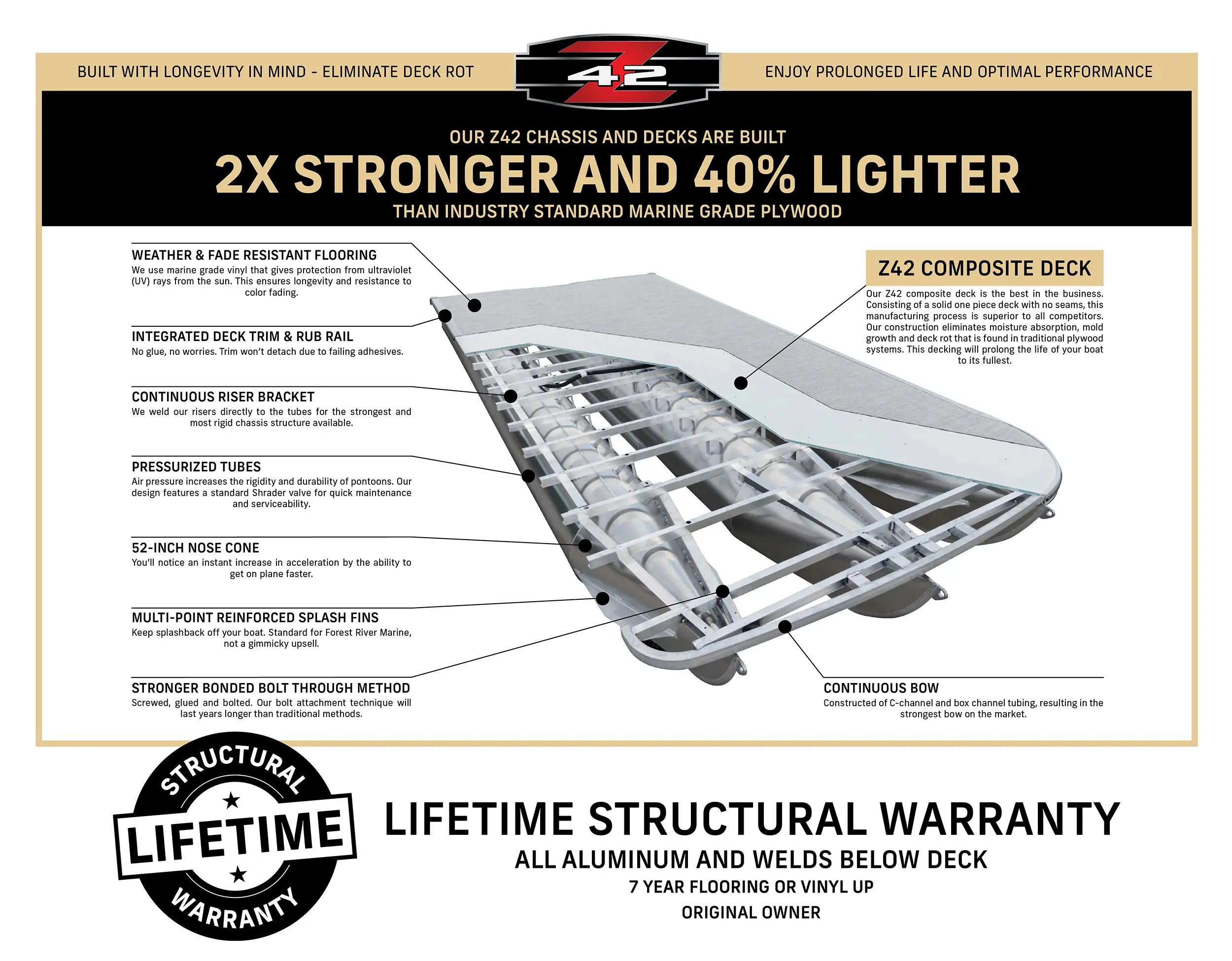 Berkshire’s Z42 chassis and composite decks are crafted for lasting strength and effortless performance. Lighter and more durable than traditional materials, they resist rot and wear—ensuring your pontoon stays reliable and refined for years to come.
